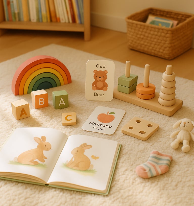 HablaKit incluye cuentos, tarjetas ilustradas y juguetes sensoriales diseñados por fonoaudiólogos para estimular el lenguaje desde los primeros meses.